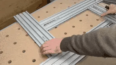 Die vier Elemente der PETATOOLS® Frässchablone werden mittels integrierter Verbinder windmühlenförmig zu einem Fräsrahmen zusammengeschraubt. Das innen entstehende Rechteck ist variabel einstellbar und dient als Schablone für die Oberfräse. Der Kopierring läuft entlang der Kante und überträgt das Maß der Schablone auf das Werkstück. Dabei ist das jeweilige Aufmaß zu berücksichtigen (Aufmaß = Kopierring - Fräserdurchmesser).